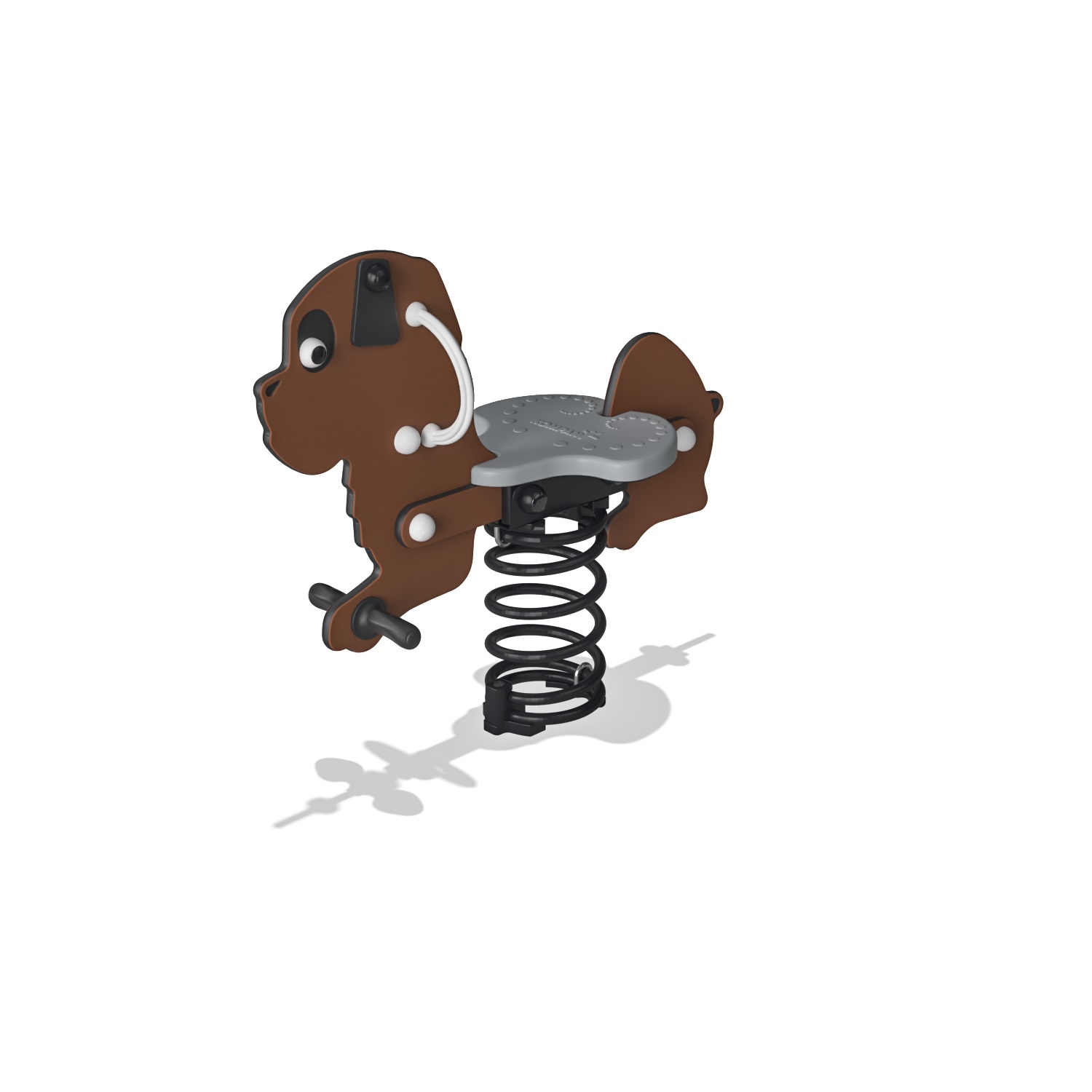 Казкова собака з великими очима з казки Ханса Крістіана Андерсена «Кресало». Сідаючи в зручне сидіння і розташовуючи ноги з боків, дитина розгойдується, контролюючи швидкість і амплітуду рухом власного тіла.