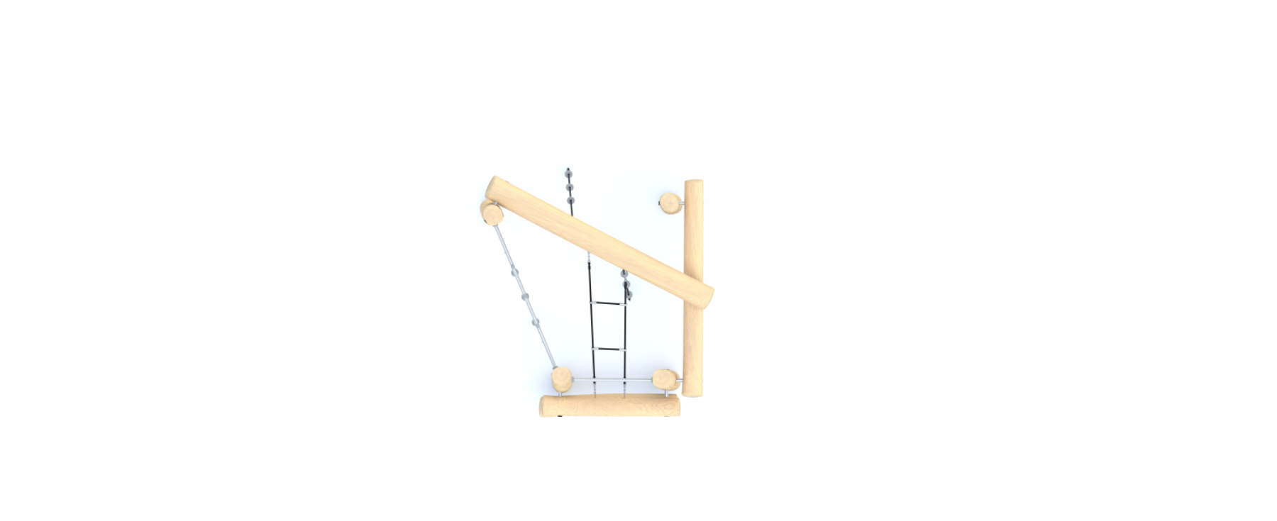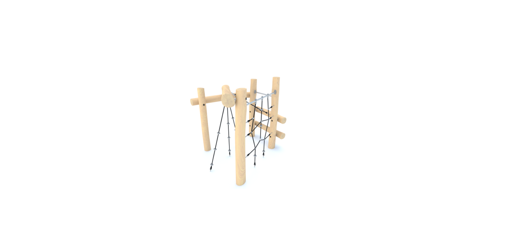 Матеріали стандартної комплектації: Конструкція виготовлена з з натуральної деревини робінії Елементи виготовлені зі сталі Кінцеві частини троса запресовані в гільзу з високоміцного алюмінієвого сплаву Канати виготовлені з поліпропілену Ланцюги виготовлені зі сталі Канатні з’єднувачі виготовлені з поліаміду Кріплення стандартної комплектації: З бетонуванням в грунт на глибину 55 см. Додаткові опції: Несуча конструкція виготовлена зі сталі AISI304 , очищеної методом піскоструминної обробки Канати типу PP multisplit зі сталевим осердям, діаметр — 16 мм Ланцюги виготовлені з нержавіючої сталі діаметром 6 мм Естетичні канатні з’єднувачі , виготовлені методом лиття під тиском |