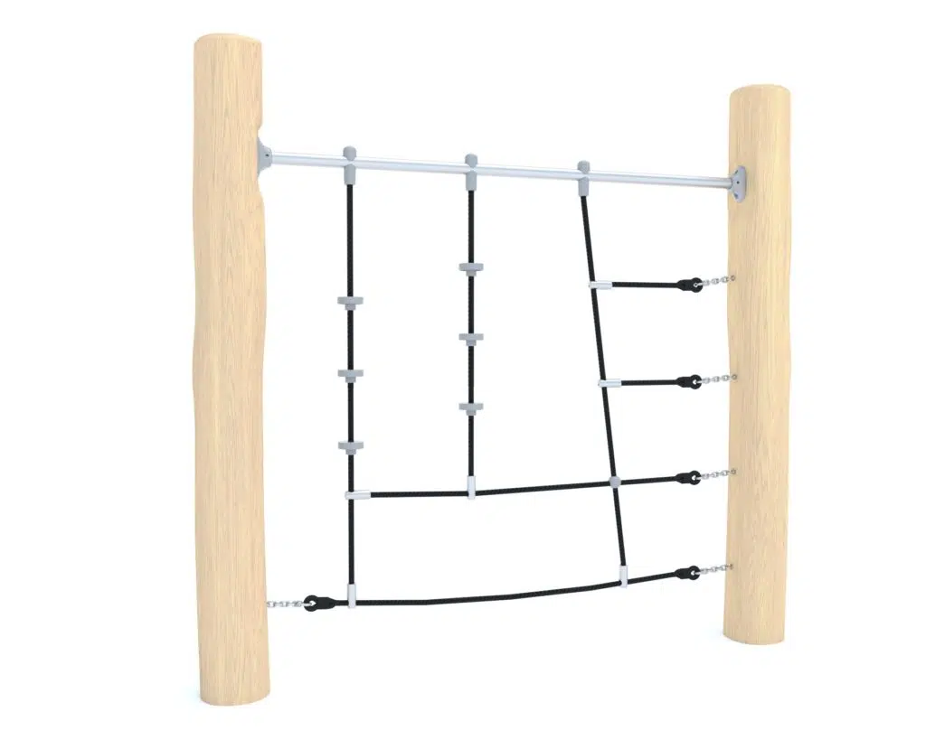 Матеріали стандартної комплектації: Несуча конструкція: сталь Елементи виготовлені з натуральної деревини робінії Кінцеві частини троса запресовані в гільзу з високоміцного алюмінієвого сплаву Канати виготовлені з поліпропілену Ланцюги виготовлені зі сталі Канатні з’єднувачі виготовлені з поліаміду Кріплення стандартної комплектації: З бетонуванням в грунт на глибину 55 см. Додаткові опції: Елементи конструкції виготовлені зі сталі AISI304 , очищеної методом піскоструминної обробки Канати типу PP multisplit зі сталевим осердям, діаметр — 16 мм Ланцюги виготовлені з нержавіючої сталі діаметром 6 мм Естетичні канатні з’єднувачі , виготовлені методом лиття під тиском Кінці троса, запресовані в гільзу з міцного алюмінієвого сплаву. Щаблі драбинок і вузли каната виготовлені з поліаміду, сформованого методом лиття під тиском (інжекційного формування). |