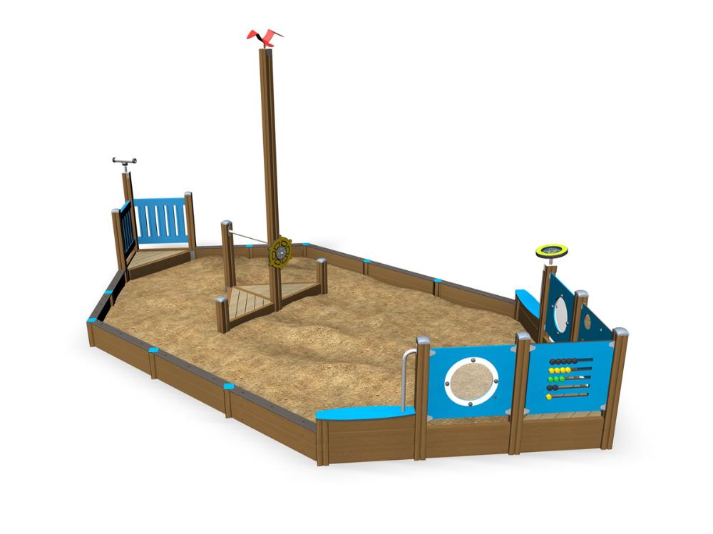 Стилізована пісочниця “Кораблик” спроектована таким чином, що дозволяє комфортно грати і дає рівні можливості всім дітям незалежно від їх можливих функціональних чи фізичних обмежень. Призначена для ігор з піском дітям на інвалідних візках, які не мають можливості користуватися самостійно традиційними пісочницями.
