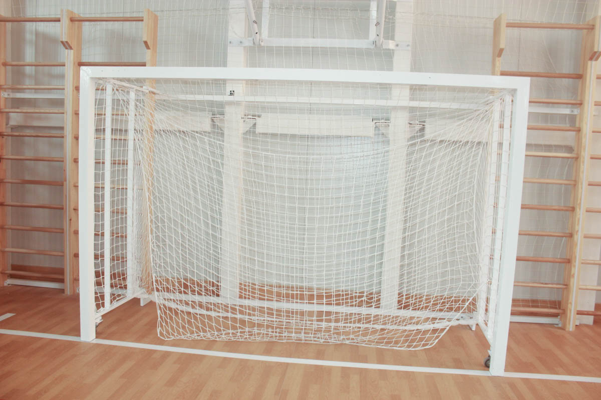 Ворота для міні футболу і гандболу шарнірно-збірні для використання в спортивних залах і на вуличних майданчиках. Ворота у зібраному вздовж стіни стані виступатимуть лише на 30 см., а отже не заважатимуть тренуватись в інших спортивних дисциплінах та економлять простір.